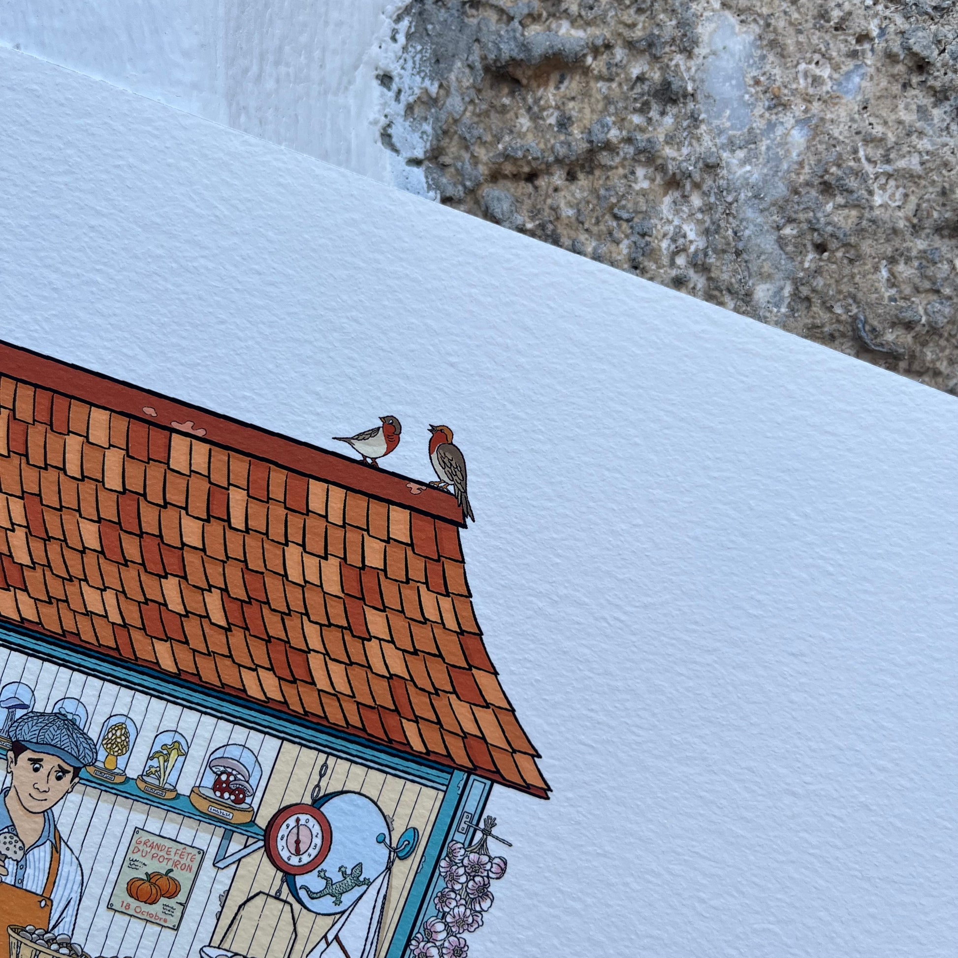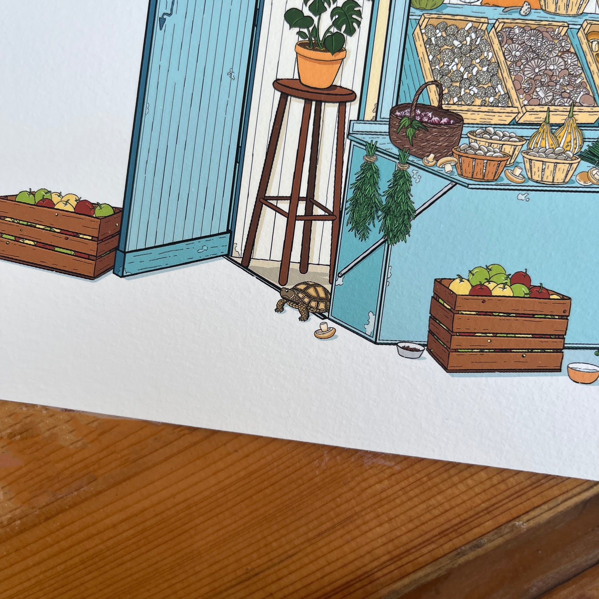Enjoy automn with my mushrooms stand illustration! A poetic visit full of colours to my mushrooms and cucurbits seller! His animals are also part of the scene.There are six… can you find them all?